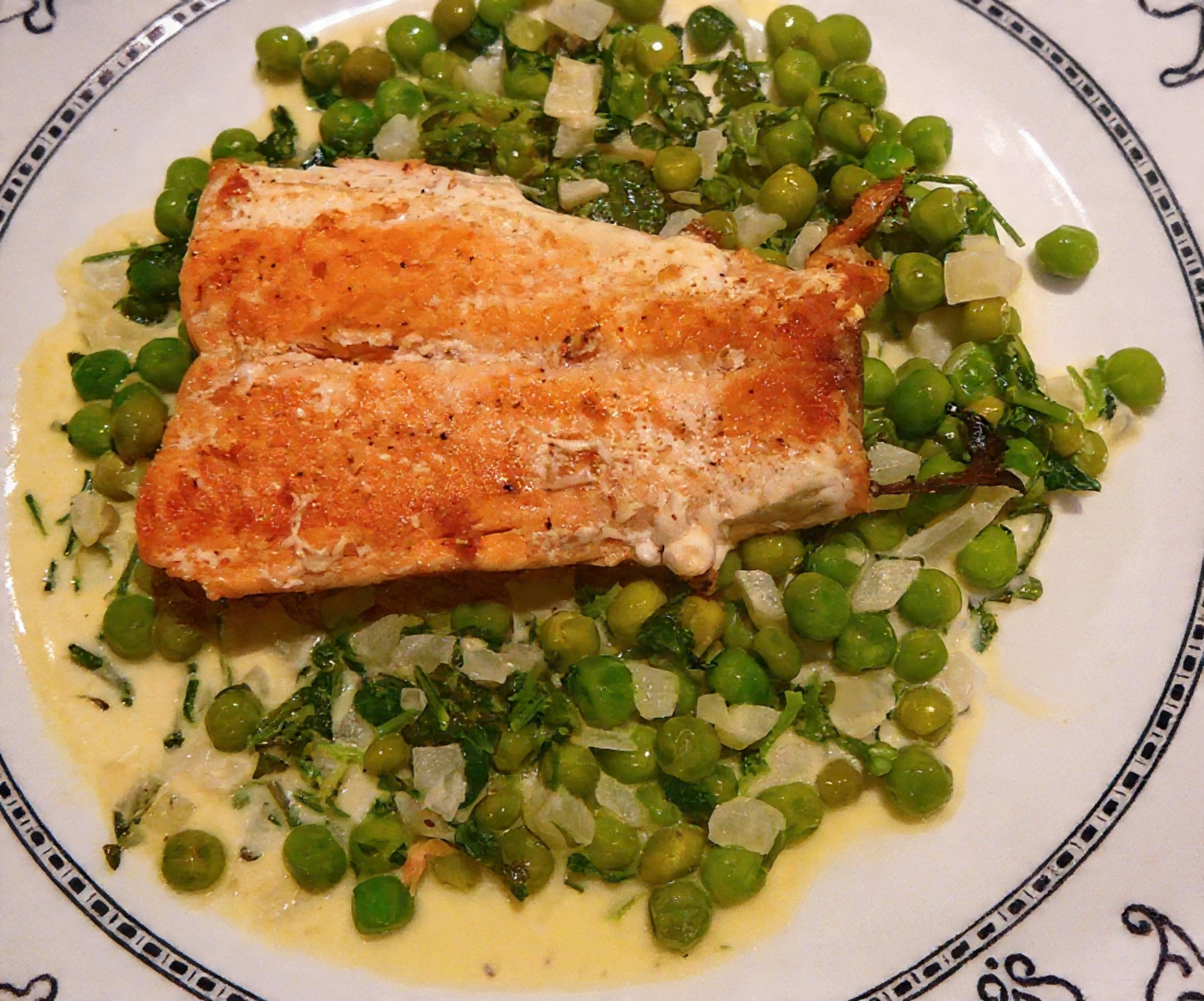 PAN FRIED SALMON WITH SHAKEN PEAS
