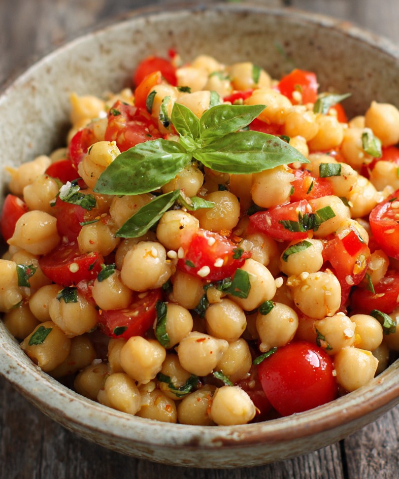 Meanwhile, mix the chickpeas with basil and vinegar in a serving dish. Set aside.