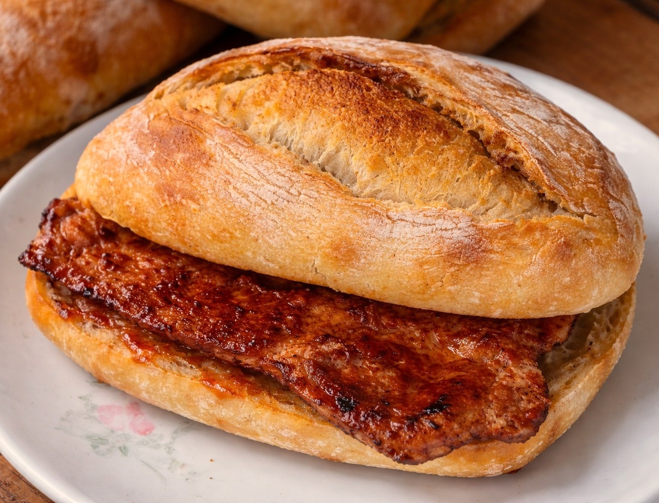 It’s usually served in a ciabatta type bun sometimes with the option of a little mustard or a drizzle of picante sauce.