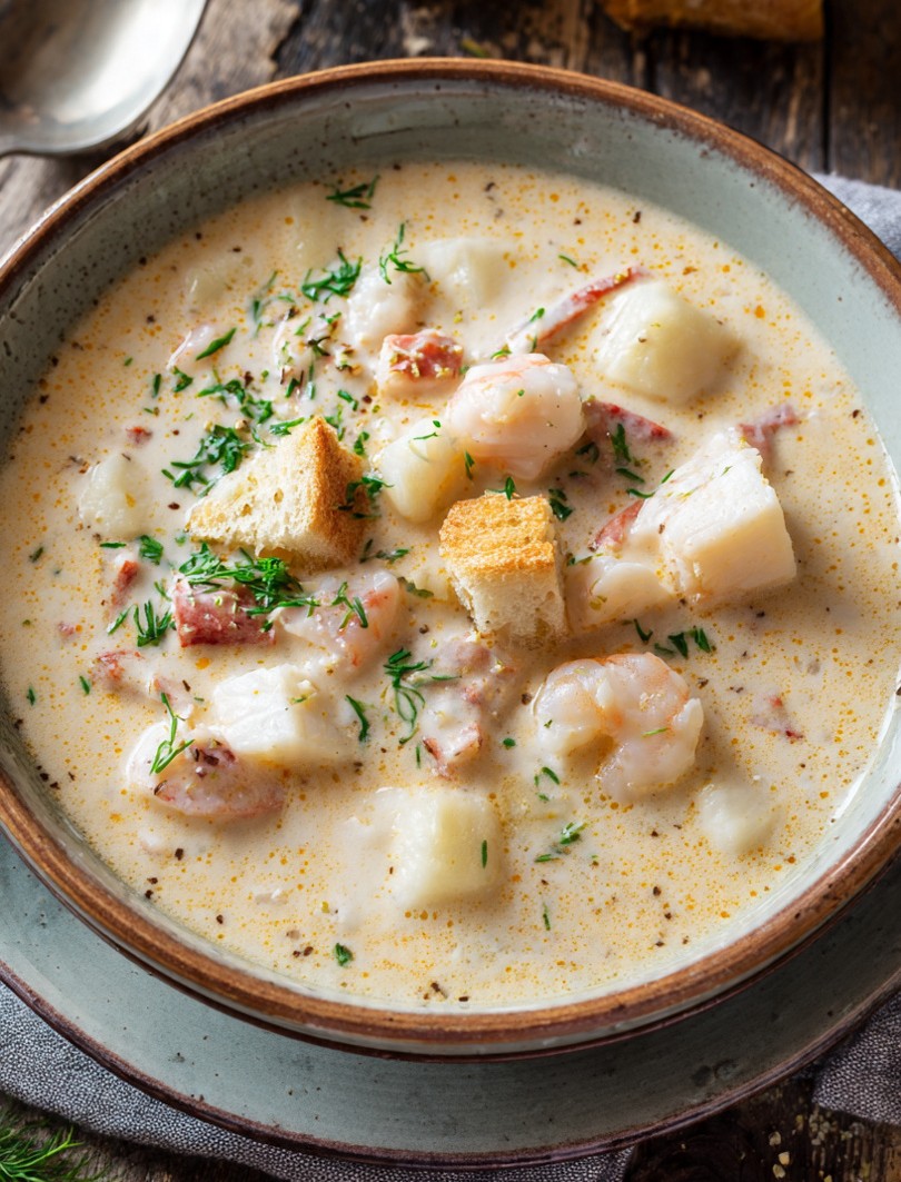 Cover and simmer until the potatoes are almost cooked, approximately 5-6 minutes. The chowder may be prepared ahead to this point.